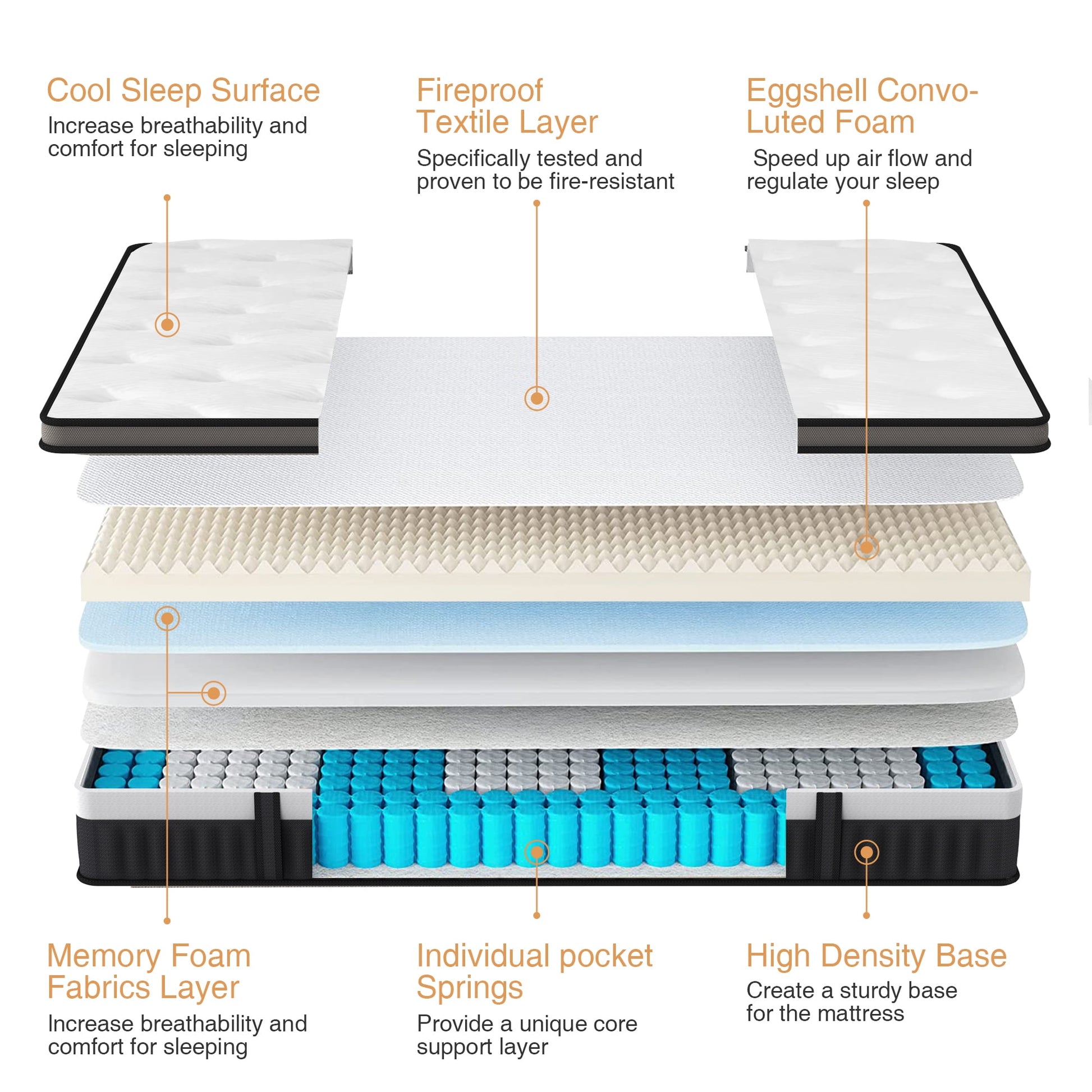 - The 14-inch fashion mattress is designed with the hybrid construction of individual pocket springs, top-quality high-density foam, and memory foam, creating a comfortable cushion medium-firm feel. Not too hard or too soft it can protect your back, neck, and waist from getting deformed, offering an all-over and average support, relieving painful pressure points on the body, and serving as a protective buffer. Fully relax your muscles, and greatly improve your sleeping quality.