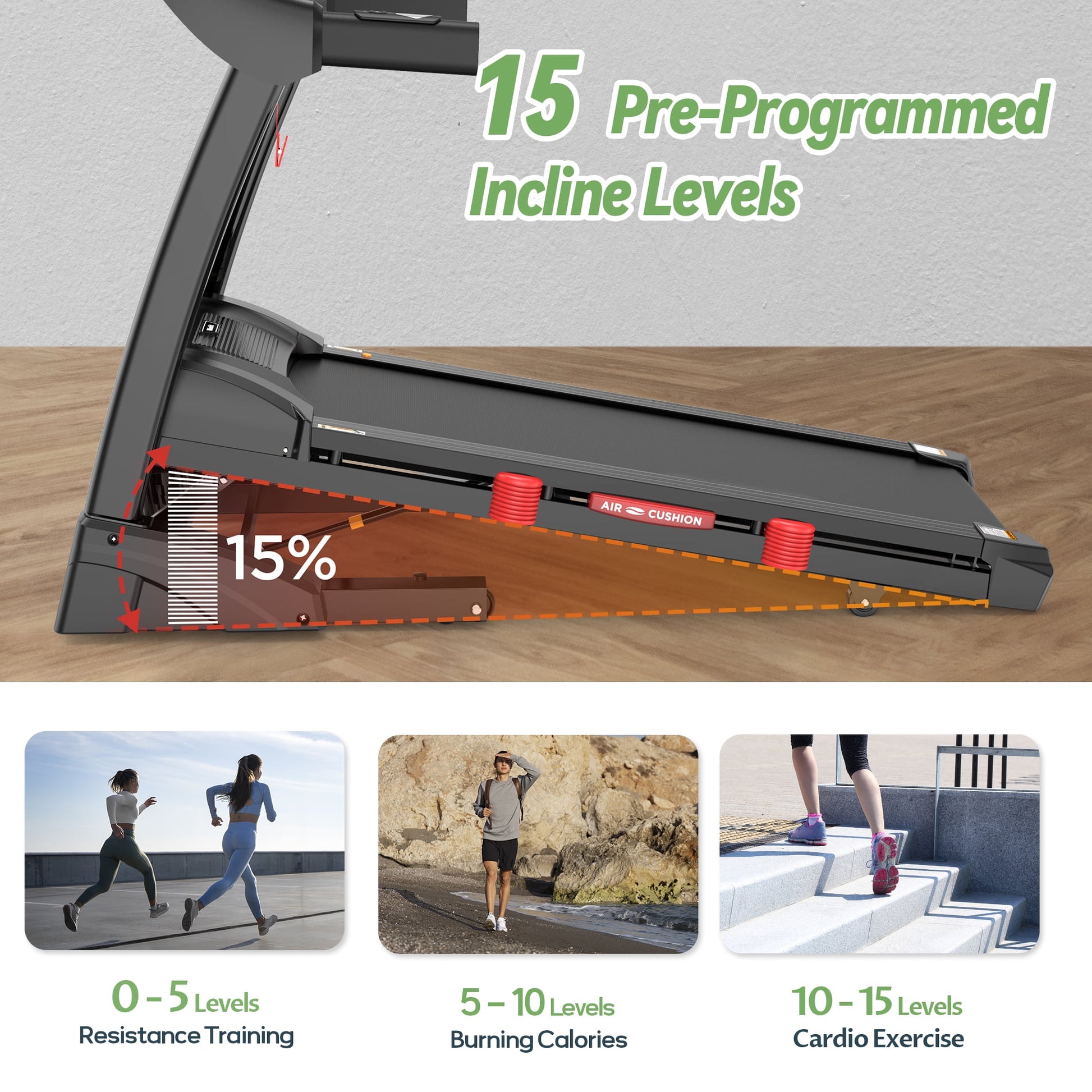 - 15-Level Auto Incline for Challenging Routines: With 15 levels of auto incline, this treadmill with auto incline simulates real-world terrain to intensify your workouts. Whether you're walking, jogging, or running on this jogging walking treadmill, the adjustable incline provides an added challenge, helping you burn more calories and improve endurance.