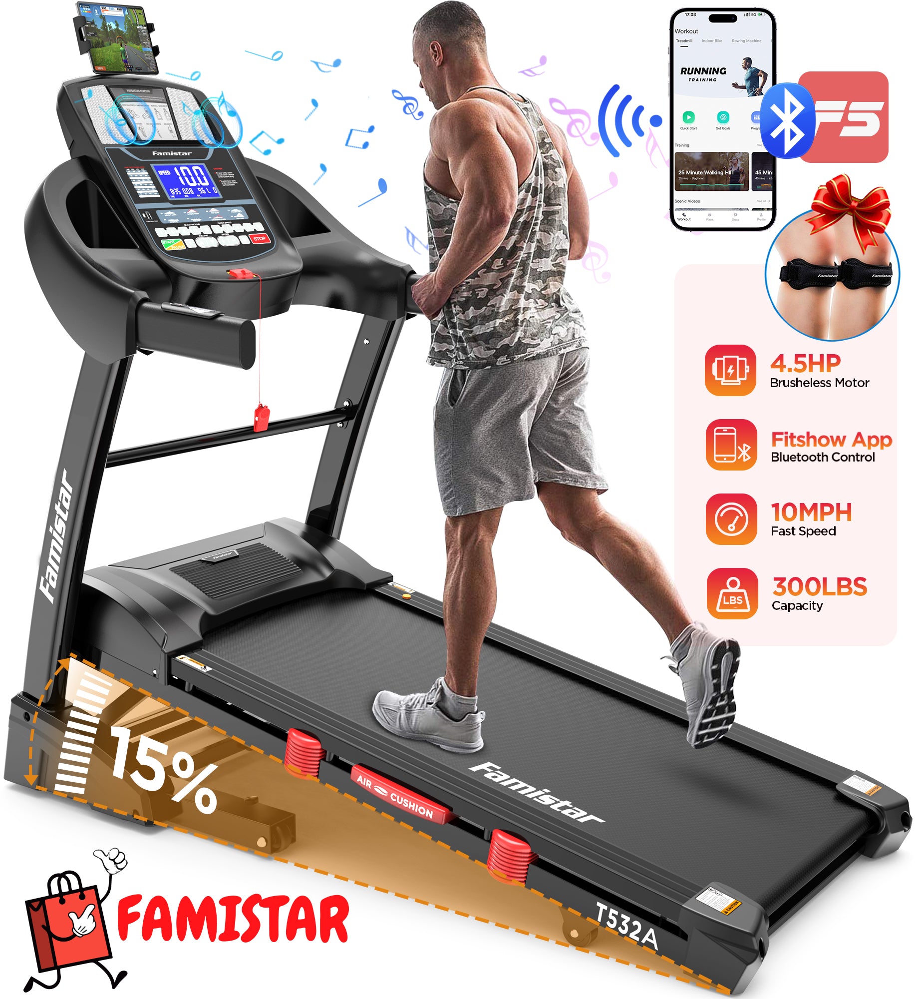Famistar T532A-B Treadmill with 15% Auto Incline, 4.5HP Motor, 10 MPH Speed, Foldable Design – Treadmill 300 LB Capacity for Home Workouts