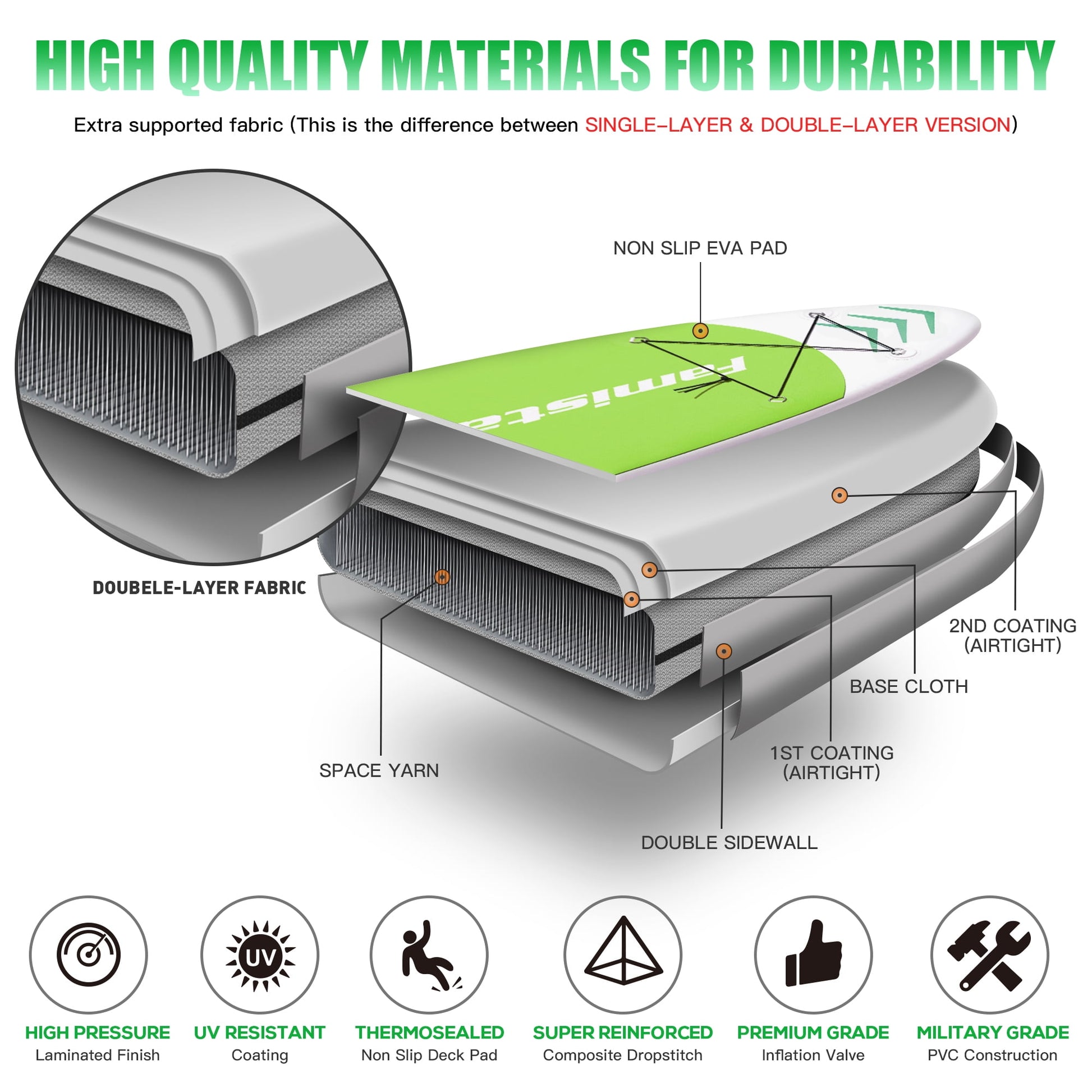 - High Quality and Sturdy -- The paddle board adopts the military grade PVC, high quality EVA and drop-stitch construction, which allow the surfboard withstand a lot of pressure without deforming or bursting. And the EVA has good friction, which will prevent you from sliding. It's sturdy and safe for long time use.