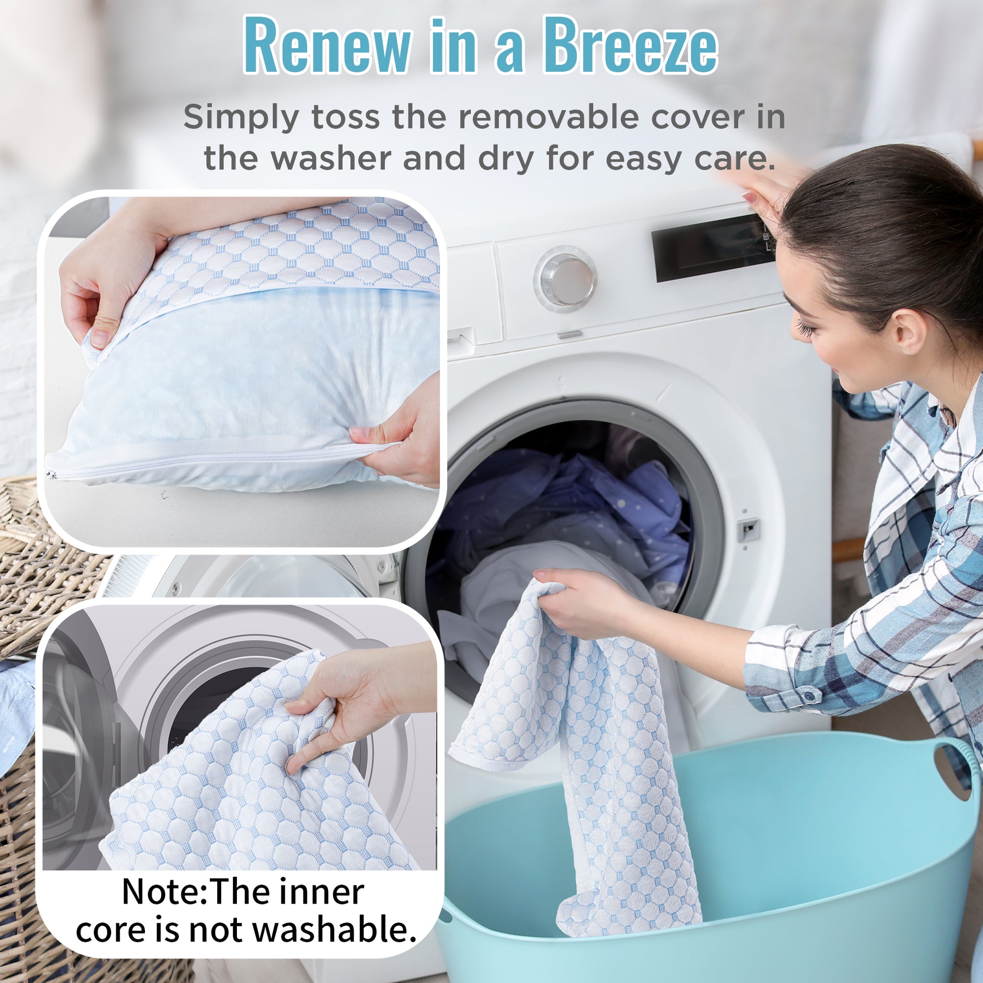 - [ LUXURY COOLING PILLOW ] The premium material enables your queen sleeping pillow to be ultra soft. Sleeping on this cooling bed pillow, just like sleeping on the cloud. So soft, so comfortable. Natural white. The cover is removable and machine washable in cold water. Easy to use, Easy to care. SAFE FOR YOU AND YOUR LOVED ONES.